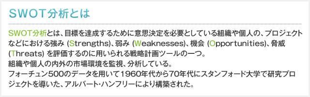 SWOT分析は様々な会社において、経営戦略やマーケティング戦略を立案する際に用いられる分析手法です。自社の現在の状況を把握し、その中から果たすべき課題を抽出致します。