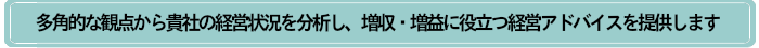 - 未来会計に基づき、貴社において到達すべき経営目標、克服すべき経営課題を整理し、具体的な行動計画に落とし込んだ経営計画書の作成と、PDCAサイクルに沿った実行管理のサポートを致します。